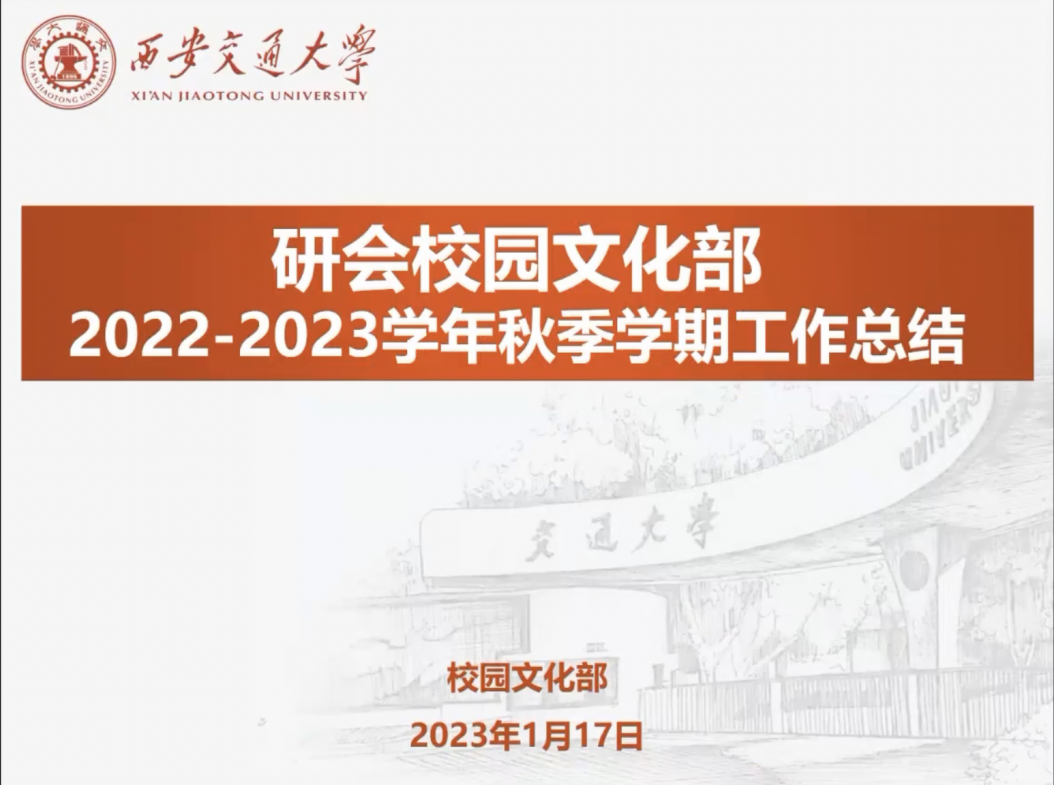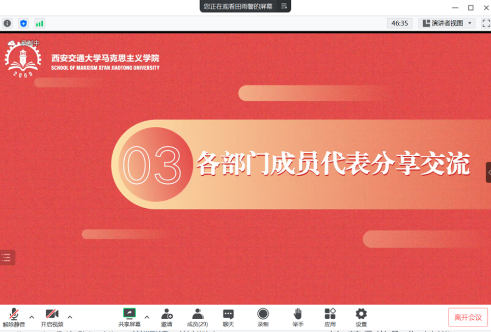 部长团成员王靖文、刘武娣、刘谋恩分别代表办公室、实践与权益服务部、校园文化部汇报本学期各部门在综合办公、实践锻炼与权益服务、文体活动方面的活动开展情况,并进行反思与规划。表达了对部员积极认真工作态度的认可,同时就本学期成员之间线下互动不多、部分活动暂未举办等问题,提出增进成员沟通,保持务实作风与充沛热情,夯实工作能力、提高工作效率,加强集体凝聚力等建议。