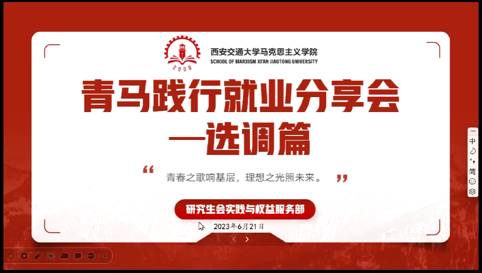 研究生会成功举办了“青马践行就业分享会——选调生篇”。本次分享会邀请到了考取江苏名校优生选调(泰州市)的刘婕、四川省急需紧缺专业选调生的任思琪和河南选调生的高露,她们从选调概况、备考经验和选岗方式等方面为大家做了认真细致的分享。本次分享会由研会实践与权益部成员杨马主持。