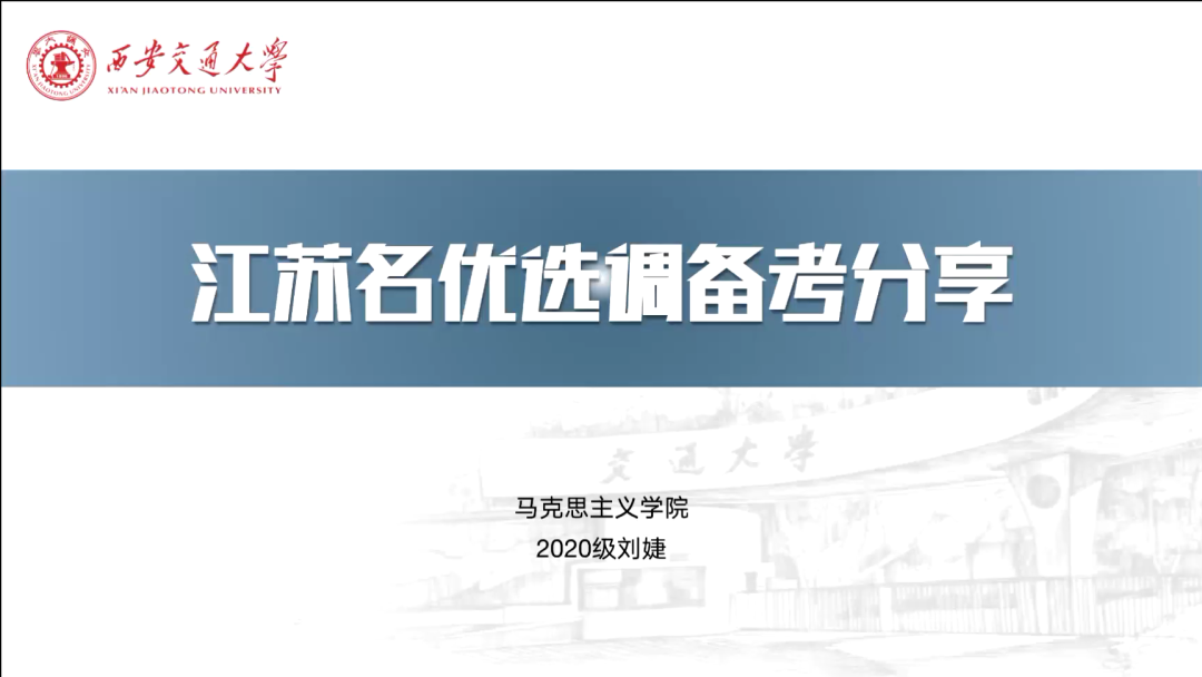 刘婕同学主要从选调概要、报考条件、职位选择、考试情况和发展待遇五个方面分享了公考经验。刘婕同学在选调概要中重点介绍了江苏名校优生选调的招考人数,考察流程和招考特点;在报考条件中介绍了校级奖励、学生干部经历与综合排名等方面的重要性;在职位选择中强调要根据个人职业发展、备考情况来综合选择城市和岗位等,就岗位比例和笔试面试备考材料等具体介绍。建议要考江苏选调生的同学尽力拔高笔试成绩,重视时政,在备考中全力以赴,同时也祝愿同学们在求职之路上能收获满意的答卷。