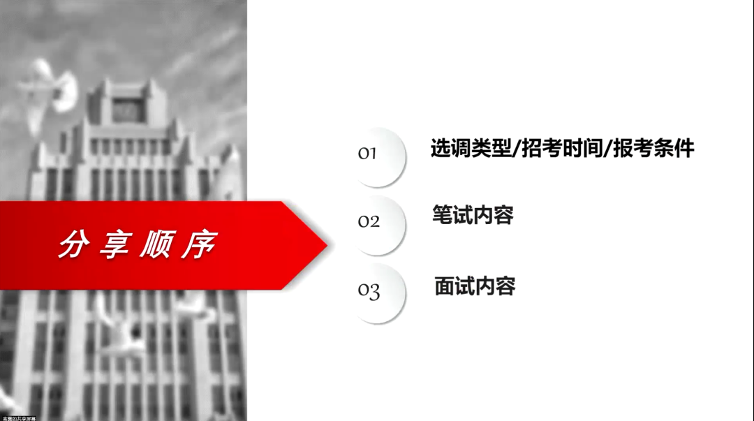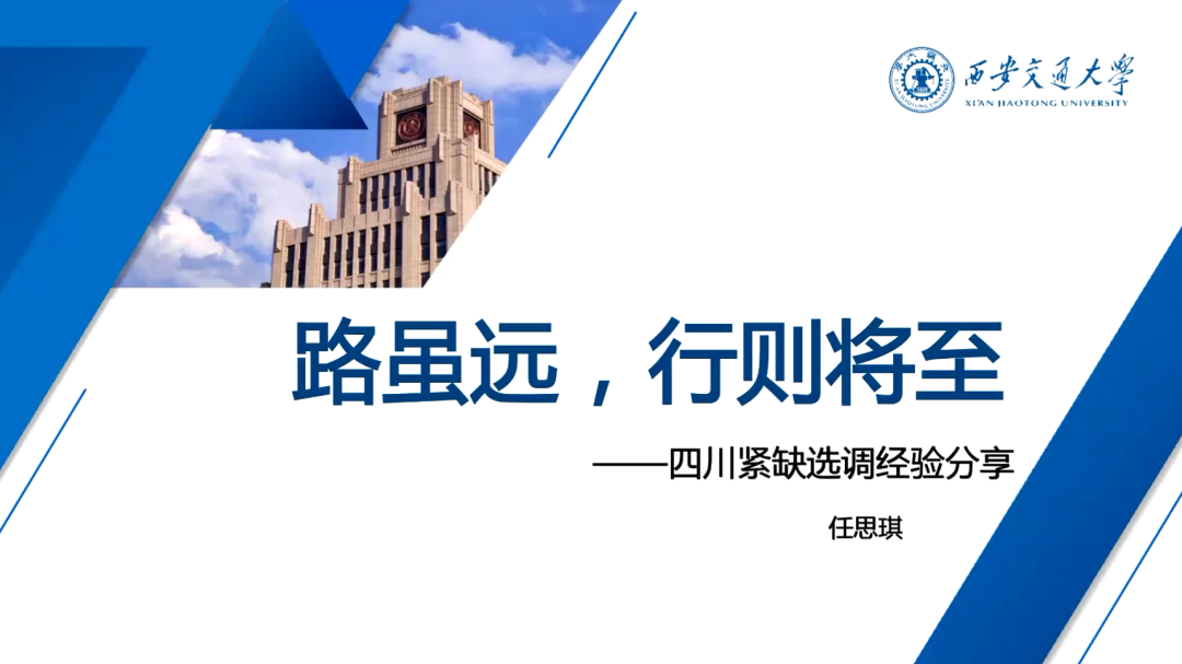 任思琪同学从考试情况、报考条件、相关政策、笔试备考、公文写作、面试备考6个方面分享了自身的备考历程。任思琪首先介绍了四川紧缺选调考试从发布公共到体检政审的整个流程及时间节点,并详细介绍了选调范围、志愿填报、考试内容和岗位分配的相关政策,其次以时政学习为例,介绍了学习时政的参考材料、做题方法及思维方法,最后就面试备考的视频资源、练习方式等做了介绍。建议同学们在备考中既要从外在的考试内容和方法方面认真学习,又要努力提升自己内在的基本素养,从内外两个方面同步发力,协调进步,相信梦想之花终将胜利开放。