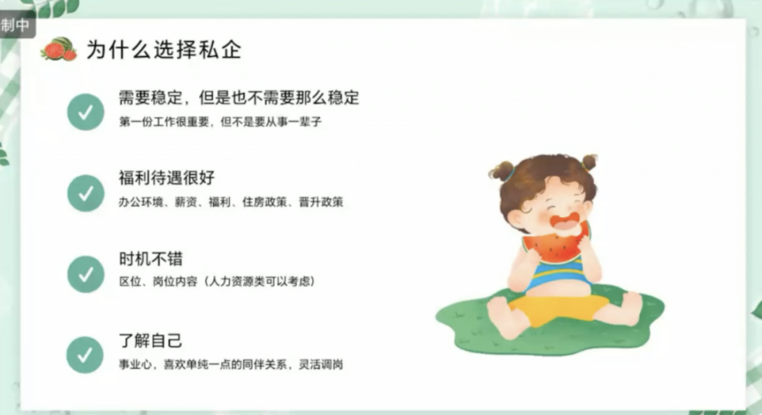 李晓婷现就职于歌尔股份人力资源本部绅士漫画岗,她首先向大家分享了自己选择私企的原因,以自己所在的企业为例,从办公环境、福利待遇、住房政策、晋升政策等方面向大家简要介绍了私企的整体概况,并建议大家不要过度执念于稳定性,可以着眼长远规划,灵活调整自己的就业方向;其次向大家介绍了如何进入心仪私企的方法,在简历投递、笔试、面试传统三环节之外,特别向大家强调了主动与细心的重要性;最后,在心态调试方面,她建议大家首先要正视本专业就业周期长的前置条件,在整个择业过程中放平心态,既学会为他人鼓掌,也不要怀疑自己,要坚信自己能够找到满意的工作。