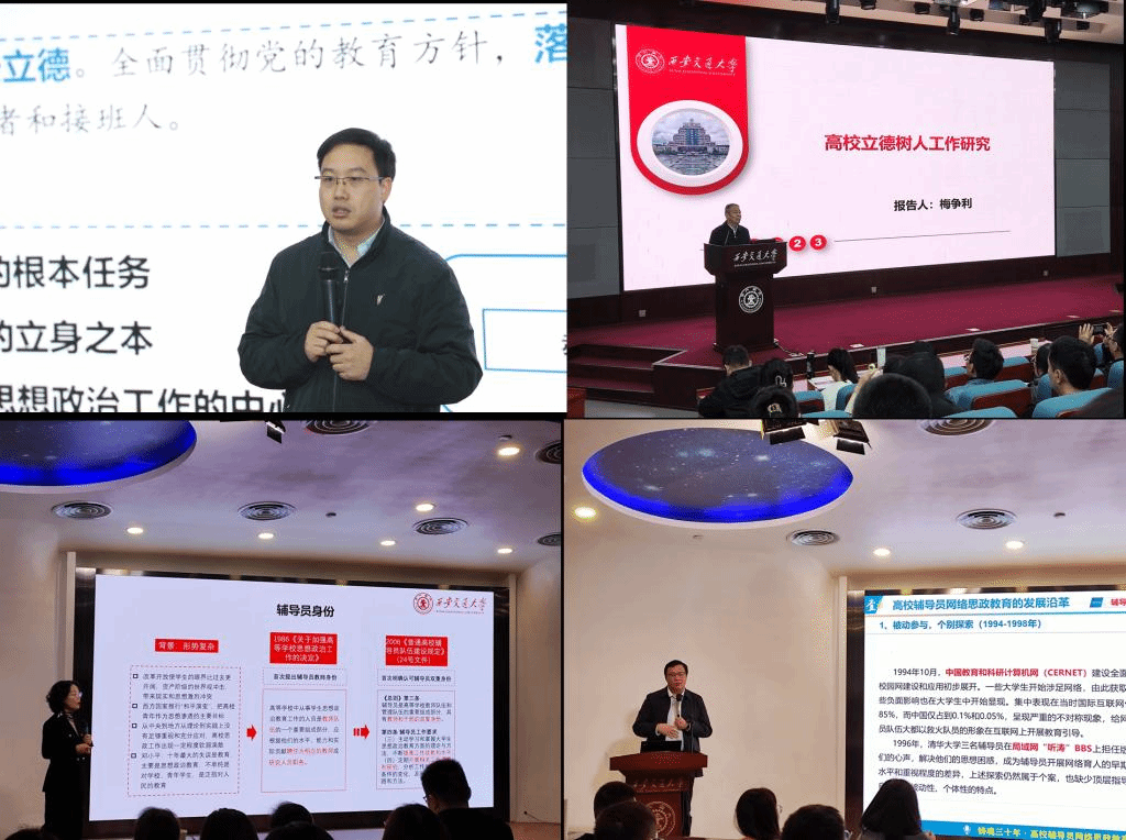 彭康书院辅导员南亚娟,陕西科技大学网络思想政治工作中心主任、陕西高校网络思想政治工作中心办公室主任、陕西省高等学校思想政治教育研究会常务副秘书长李萌分别作“高校立德树人工作体系研究”“‘一站式’学生社区综合管理模式建设概况与思考”“谈辅导员如何开展价值引领工作与研究”“铸魂三十年——高校辅导员网络思政教育的历史沿革与启示”等4场专题讲座。还设置了绅士漫画