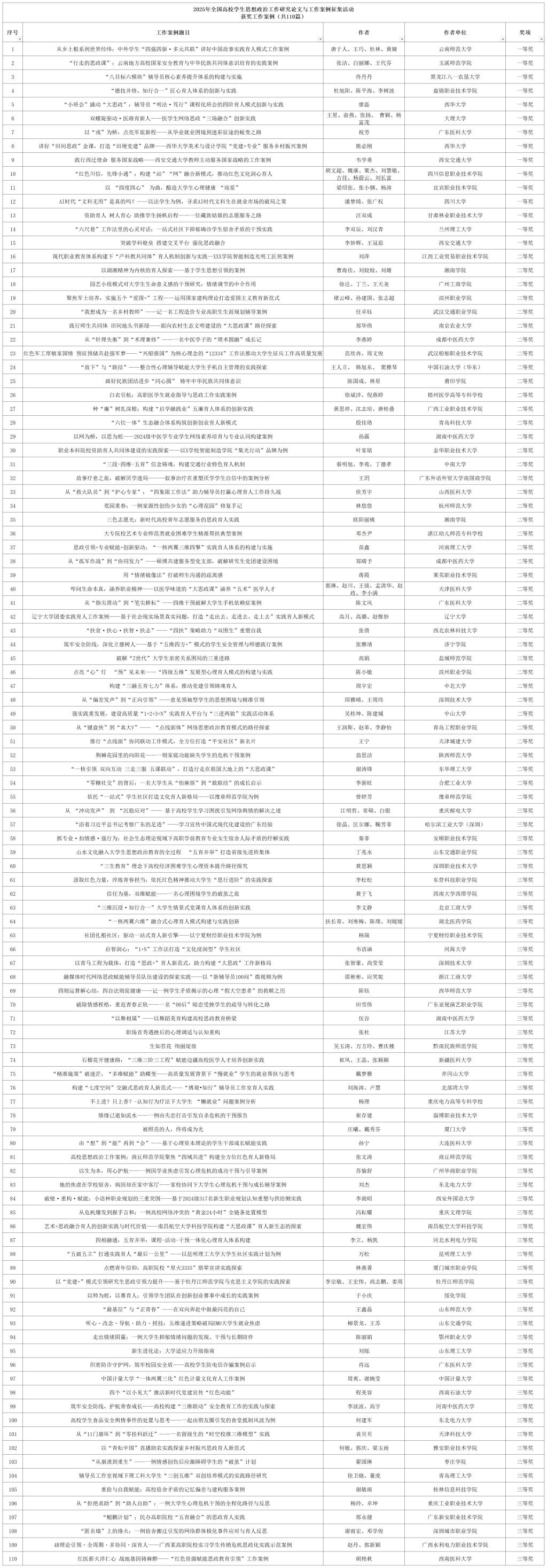 本次活动共收到全国617所高校及高职院校投稿的论文384篇、工作案例782篇。中心组织专家初审和复审,按照规范性、学术价值、理论深度、学术创新性及可推广性等进行综合考量,共评出论文70篇,其中一等奖10篇,二等奖25篇,三等奖35篇;评出工作案例110篇,其中一等奖15篇,二等奖40篇,三等奖55篇。现将获奖名单予以公布,详见附件。