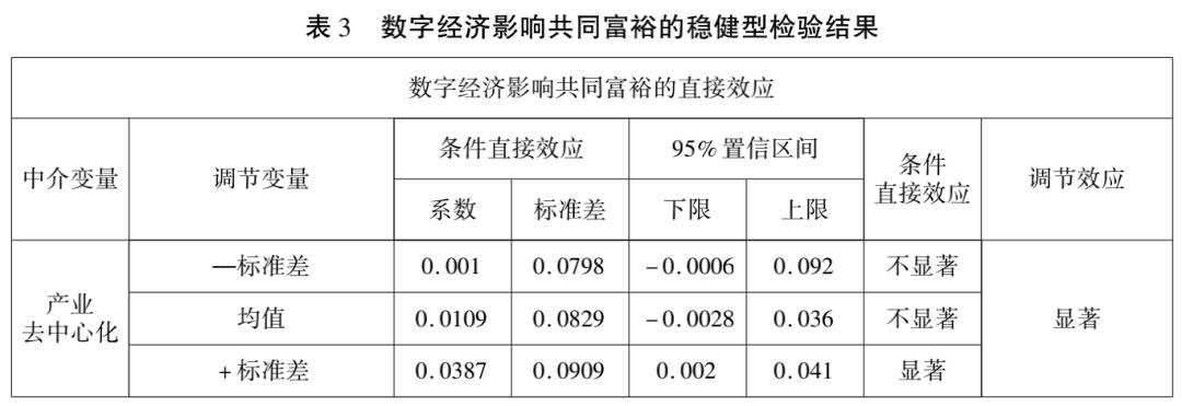 (2)数字经济对共同富裕的中介效应为正且没有通过1%水平的显著性检验。根据表3可以看出,产业去中心化均值水平下,中介效应为0.047,这说明数字经济下,数字技术的发展,以信息流为牵引,促进产业链中物流、资金流、商流的快速重组融合,催生出产业资源在线调配、协同制造、产能共享、跨区域写作等新的生产模式,降低了交易成本。线上交易规模的快速提升,使得原来大规模集中于少部分地区的产业集聚程度出现下降,推动了产业的去中心化,即使是落后地区也可以参与到分工中,实现收入的增加。而且由于传统的边际收益递减规律,落后地区的增长速度超过发达地区,从而实现共同富裕的目标。