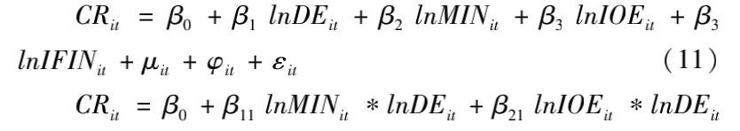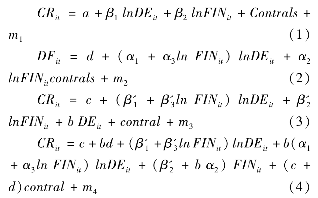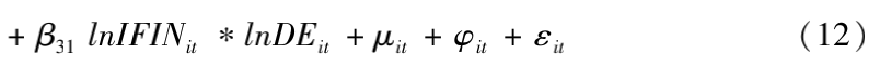方程(1)表示数字经济对共同富裕的总效应;方程(2)表示数字经济对市场一体化的效应;方程(3)表示将总效应分解为数字经济的直接效应和中介的间接效应。将(2)带入式(3),得到方程(4),直接效应为β'1+β'3lnFINit,中介效应为b(α1+α3lnFINit)。