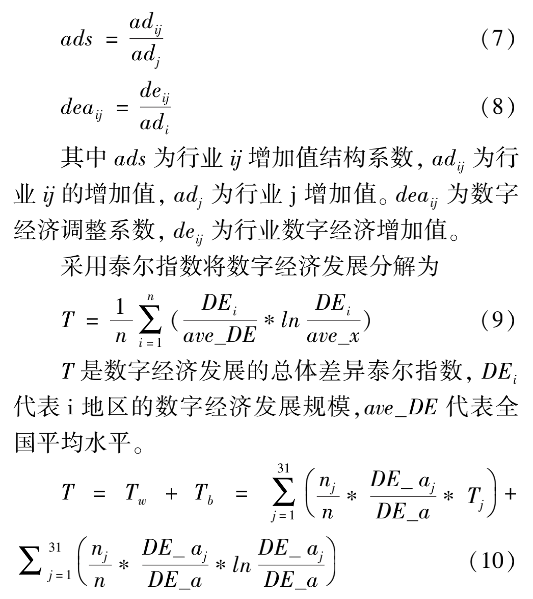 (1)数字经济。目前研究数字经济一般是基于国家层面和行业层面,对于地区层面的数字经济规模尚没有测度。在行业上,根据《国民经济行业分类(2017)》,数字经济生产包括C-39、I-64和I-65的相关行业,C-39对应投入产出表中的“通信设备、计算机和其他电子设备”门类,I-64和I-65则对应投入产出表中的“信息传输、软件和信息技术服务”门类,将二者的产出增加值相加便是地区该年度数字经济生产的增加值。投入产出表是五年编制一次,未编制年份的数字经济增加值则需要通过统计年鉴数据和工具系数进行估算。具体为,通过已知年份的“通信设备、计算机和其他电子设备”增加值占“制造业”总增加值的比重获得“通信设备、计算机和其他电子设备”的增加值结构系数,也即数字经济调整系数,假设数字经济调整系数在短期内不发生变化,结合地区各年制造业增加值可获得缺失年份“通信设备、计算机和其他电子设备”增加值;依此,同样可获得“信息传输、软件和信息技术服务”缺失年份的增加值。对于数字经济的地区差异度,借鉴许宪春和张美慧(2021)[32]、韩兆安等,(2021)[33]的研究方法,基于地区投入产出表,先计算需要对数字经济增加值和总产出等进行估算,假设数字经济中间消耗占数字经济总产出的比重与相应产业中间消耗占总产出的比重相同,在估算过程中需要借助以下工具系数:行业增加值结构系数。由于中国地区投入产出表中只提供了42个门类产品的投入产出值及增加值数据,需要引入“增加值结构系数”来推算数字经济相关行业的增加值数据,公式为: