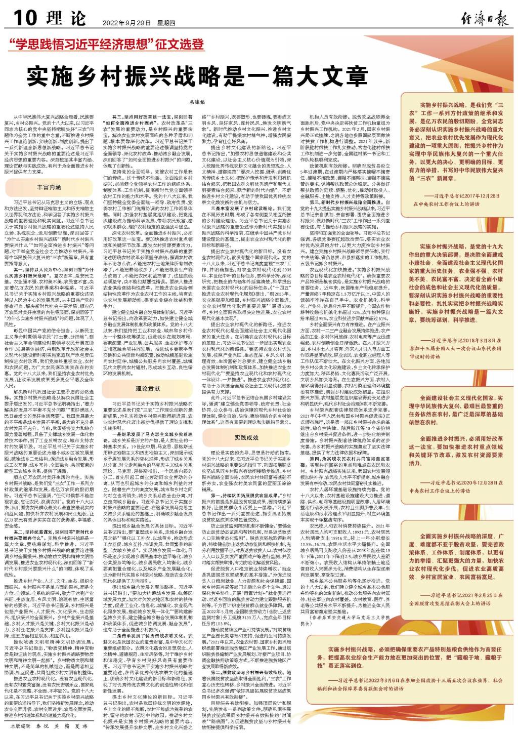 习近平总书记关于实施乡村振兴战略的重要论述是我们党“三农”工作理论创新的最新成果,为扎实推动乡村振兴取得新进展、农业农村现代化迈出新步伐提供了理论支撑和实践指引。