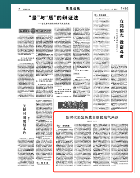 习近平总书记深刻指出,在新的赶考之路上,我们能否继续交出优异答卷,关键在于有没有坚定的历史自信。知所从来,方明所往。坚定历史自信不是臆想的,其底气来自党百年奋斗取得的重大成就、以伟大建党精神为源头的中国共产党人精神谱系和对党的百年历史经验的深刻总结。