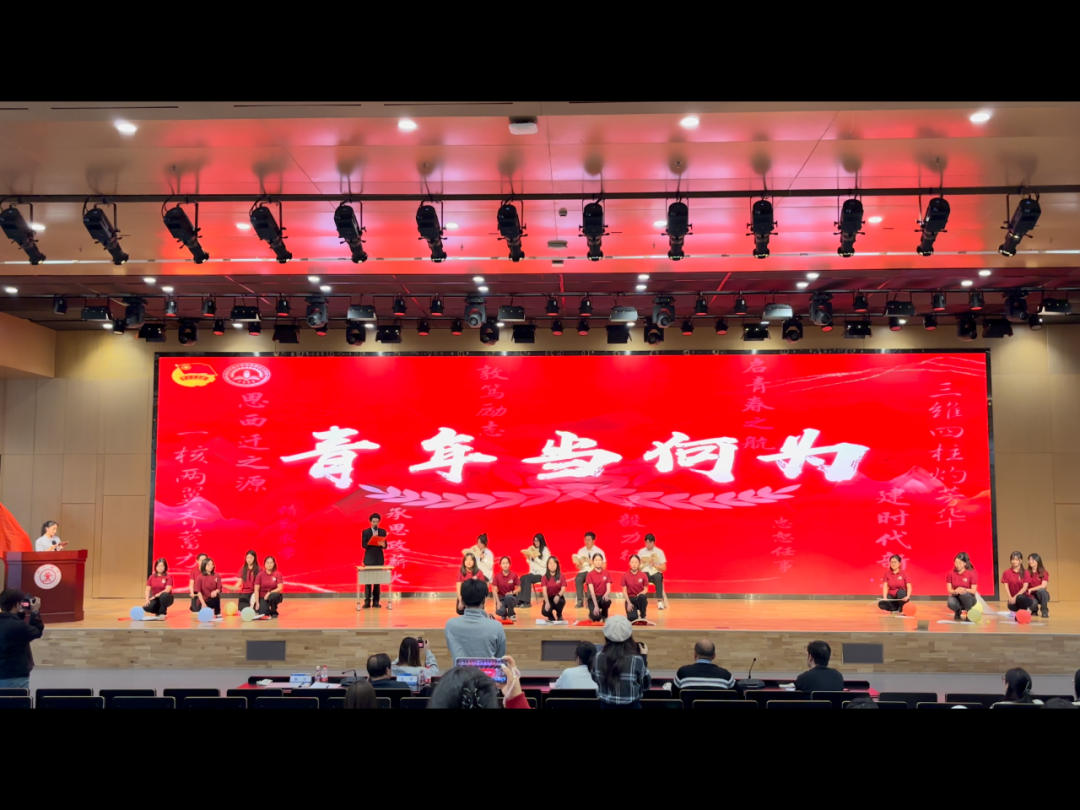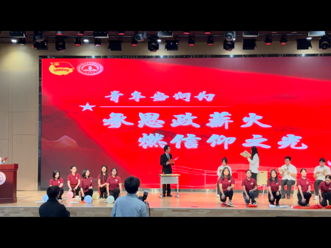 决赛当天,支部全体成员前往创新港5-2E201(千人报告厅)助力最佳团日决赛。答辩以翻转课堂的形式,由班长李冼卡特同学扮演老师,提出“青年当何为?”的议题;由四位学生扮演者及其他支部成员演出支部各项团日活动。